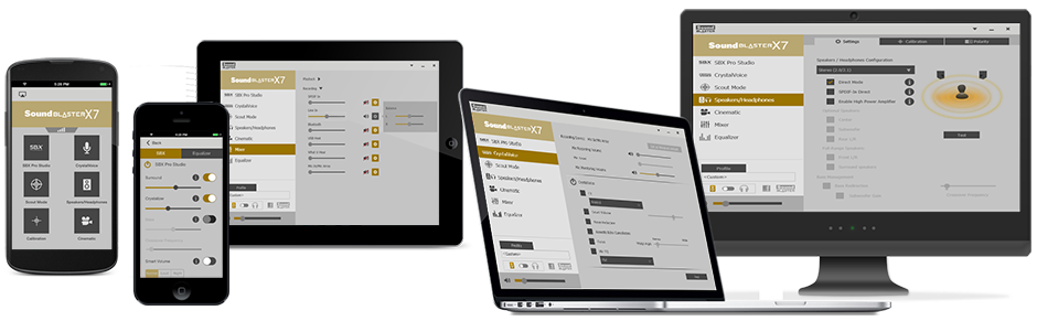 Sound Blaster X7 Limited Edition leveres med praktsk programvare som fungerer som din personlige lydkontroller, på den stasjonære datamaskinen, den bærbare, nettbrettet eller smartenheten. Vi introduserer Sound Blaster X7 Control-appen og Sound Blaster X7 Control-programvaren.