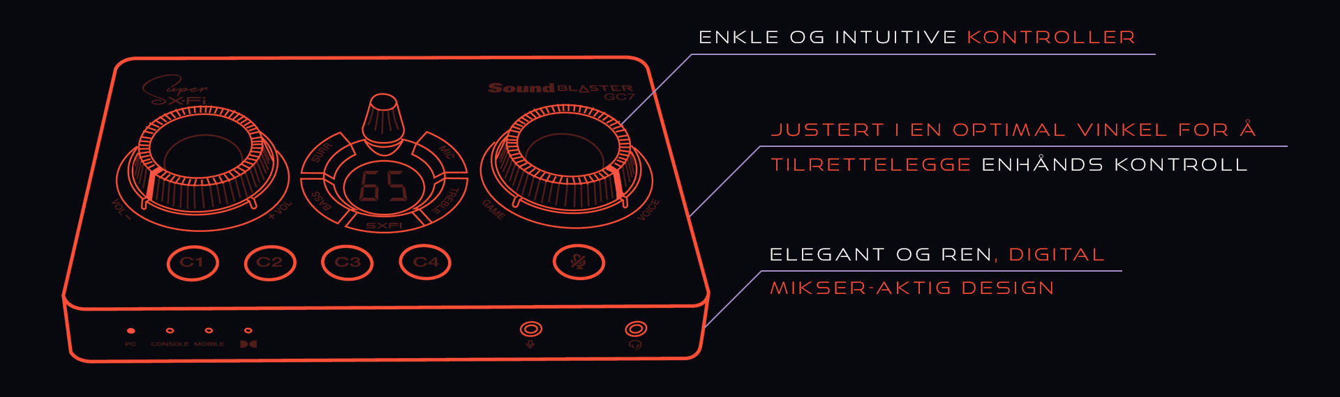 Som den første av sitt slag av premium lydløsninger for erfarne spiller gir Sound Blaster GC7 deg vinner-formelen til å mestre ethvert spill—tilgang til en mengde programmerbare kontroller, innebygd direkte i enheten, for raske bytter når man spiller.