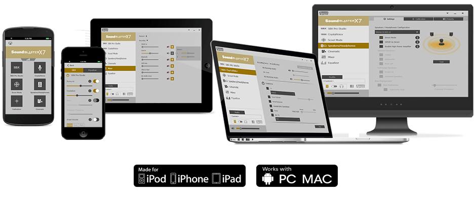 Sound Blaster X7 leveres med praktsk programvare som fungerer som din personlige lydkontroller, på den stasjonære datamaskinen, den bærbare, nettbrettet eller smartenheten. Vi introduserer Sound Blaster X7 Control-appen og Sound Blaster X7 Control-programvaren.