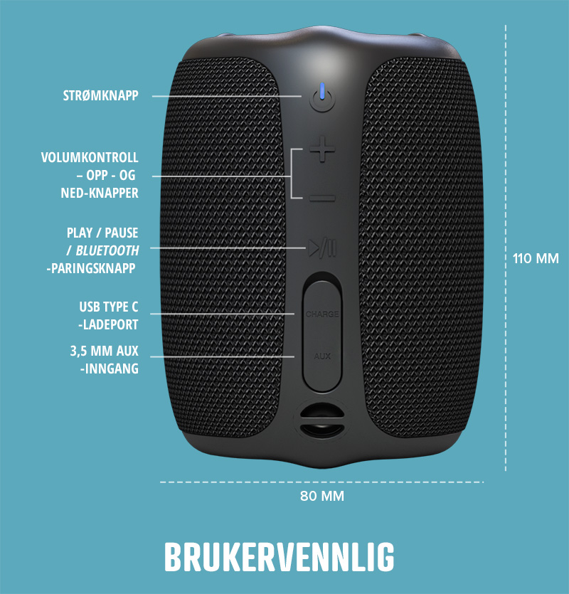 Creative MUVO Play er vår siste bærbare og IPX7-sertifiserte vanntette Bluetooth-høyttaler som er full av funksjoner. Med doble mikroelement og doble bassradiatorer, høres MUVO Play mye større ut enn den er! Den er utformet til å brukes utendørs, og med dens lette vekt på 360 gram kan du ta den med deg til bassengfester, campingturer eller ditt neste spennende eventyr!
