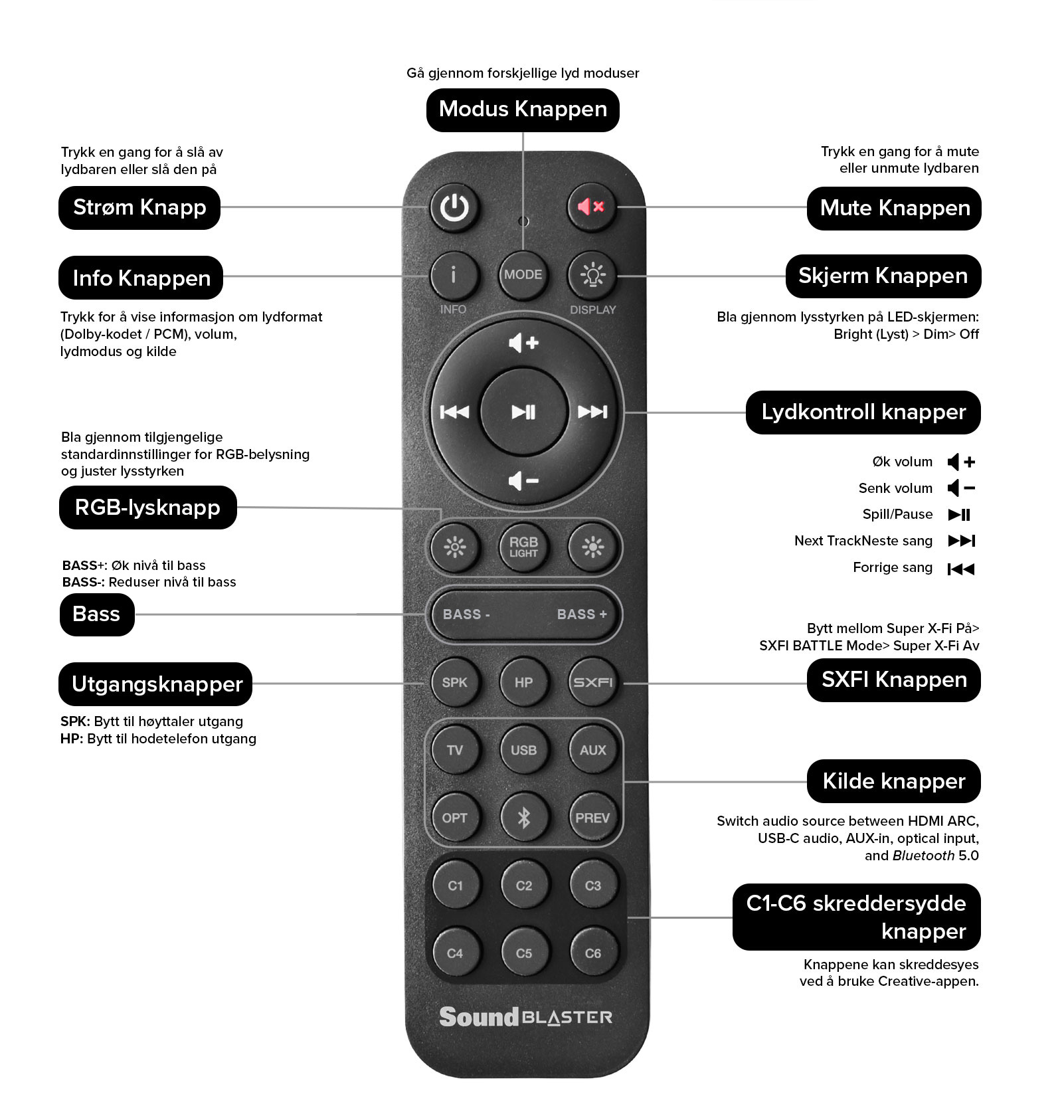 Sound Blaster Katana SE er også veldig allsidig, med en rekke porter og tilkoblingsmuligheter som spenner fra USB-lyd, HDMI ARC, Bluetooth® 5.0 for trådløs strømming av lyd, optisk inn, SXFI-ut, kontakt for hodetelefon og en 3,5 mm AUX -inn for analog lyd. Lydplanken kan også monteres på veggen, slik at du også kan montere den på veggen under TV-en.